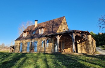 A environ 9 km du Bugue, à la campagne mais non isolée, Maison perigordine en pierres de 2009, aménagée sur 2 niveaux d'env 130m2. Au rez de chaussée : Pièce à vivre d'env 57m2 avec partie cuisine aménagée, poêle à bois côté salon, bien éclairée avec sortie sur terrasse couverte. Cellier, wc, salle d'eau et chambre de plain pied. A l'étage : Palier, 3 chambres dont une plus petite et salle de bains. En appentis : Remise. piscine hors sol. Beau terrain de 5183m2 en prairie et bosquet.