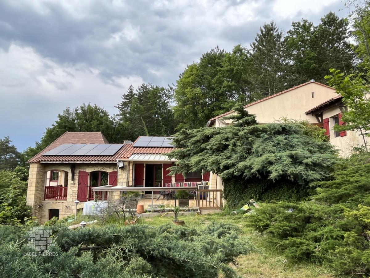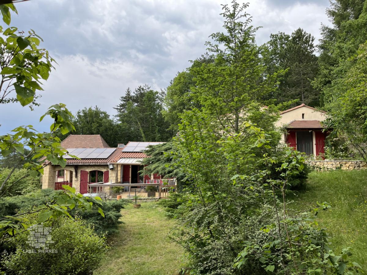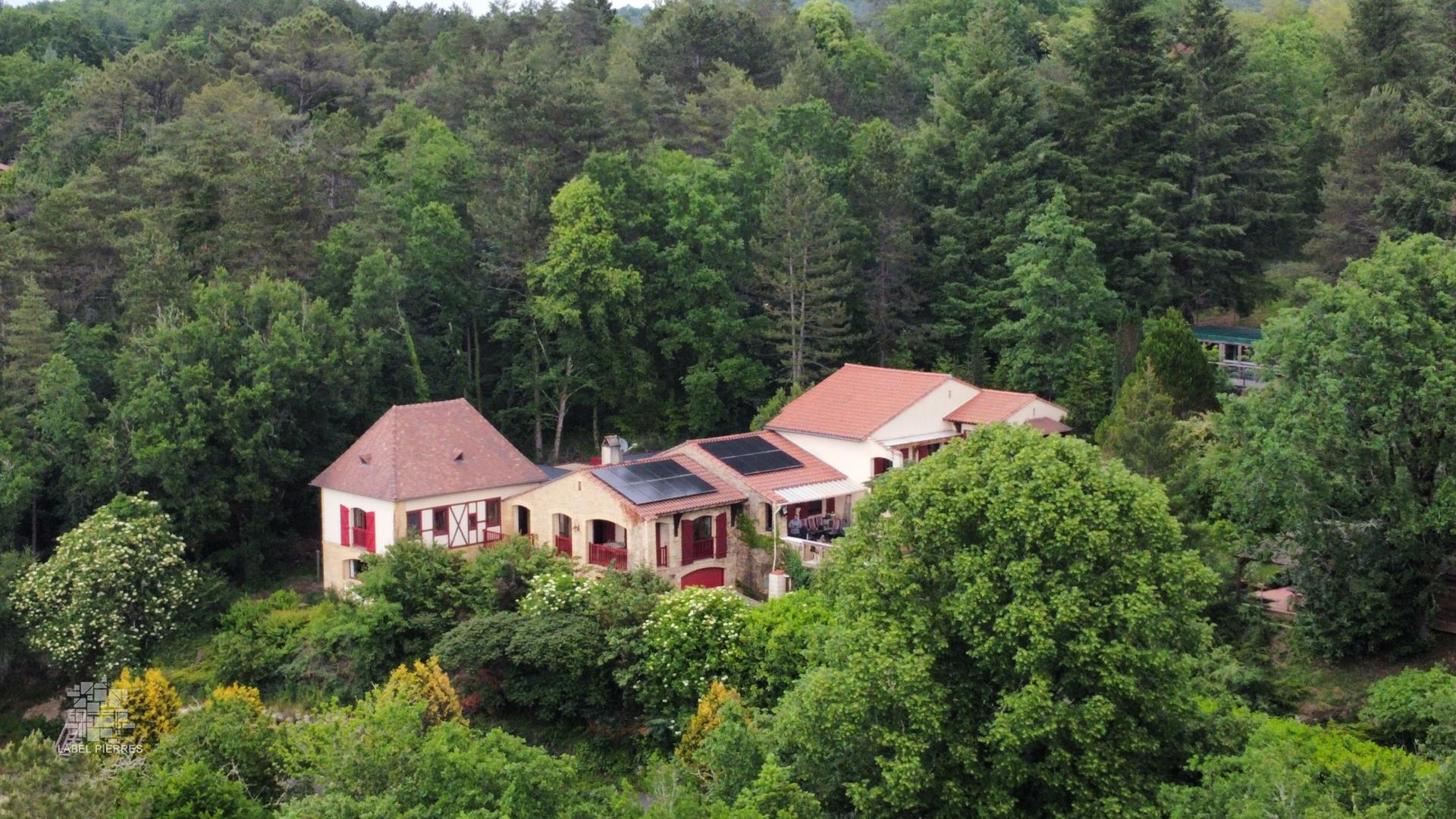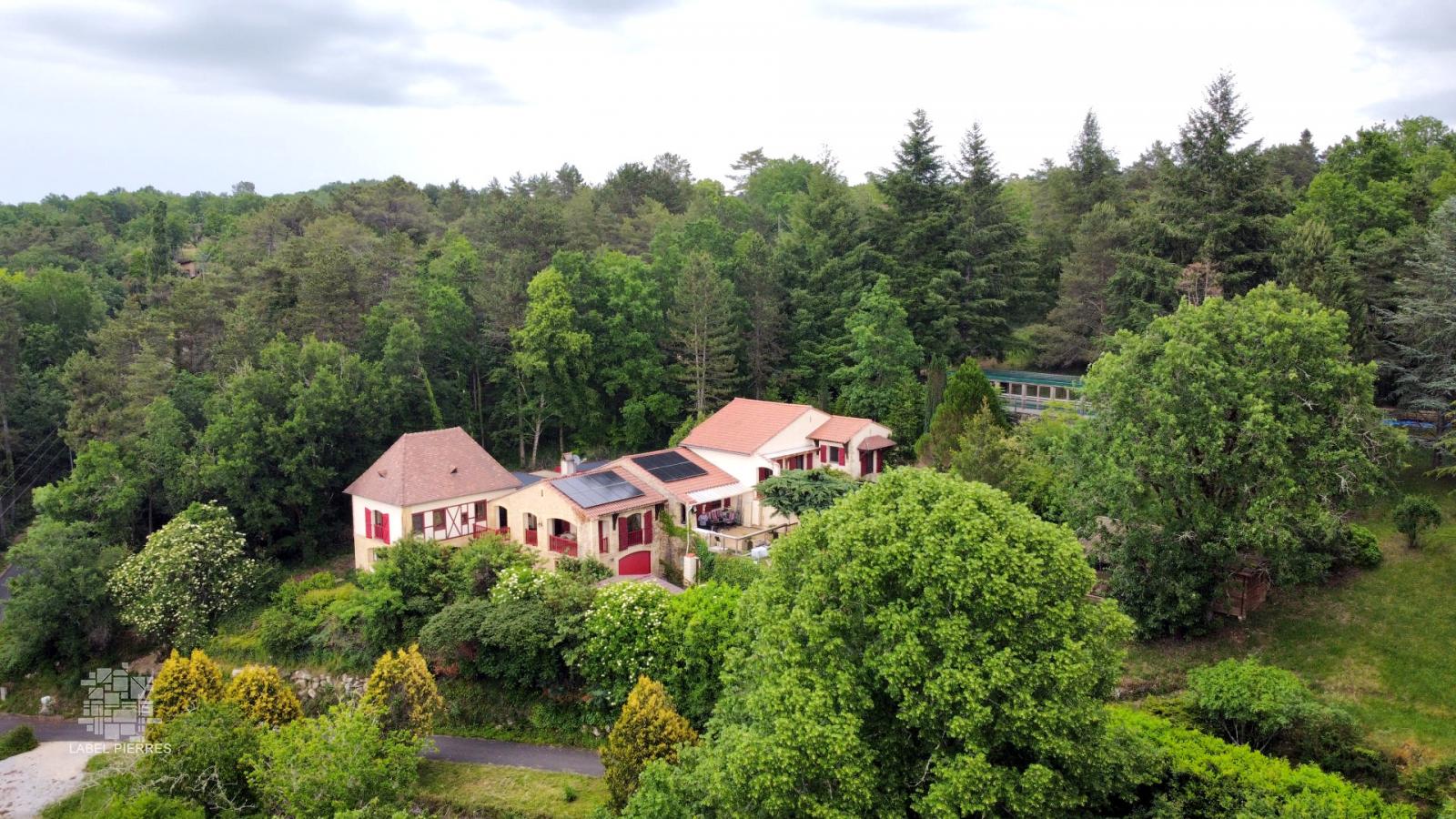 Exclusivité! Nichée dans un coin de verdure sur les hauteurs de Montignac avec très belle vue, propriété comprenant une grande maison principale et une maison d'amis sur 1,6 ha. Piscine couverte. Nombreuses terrasses.