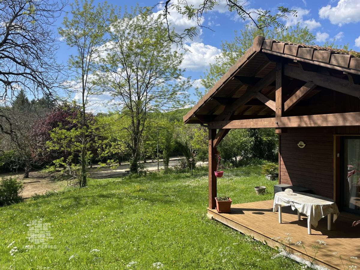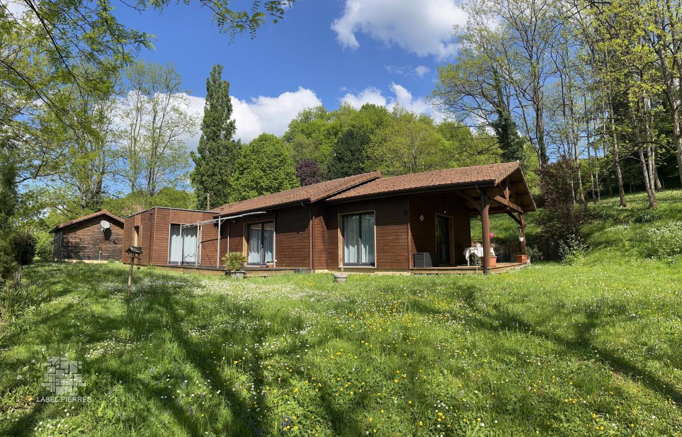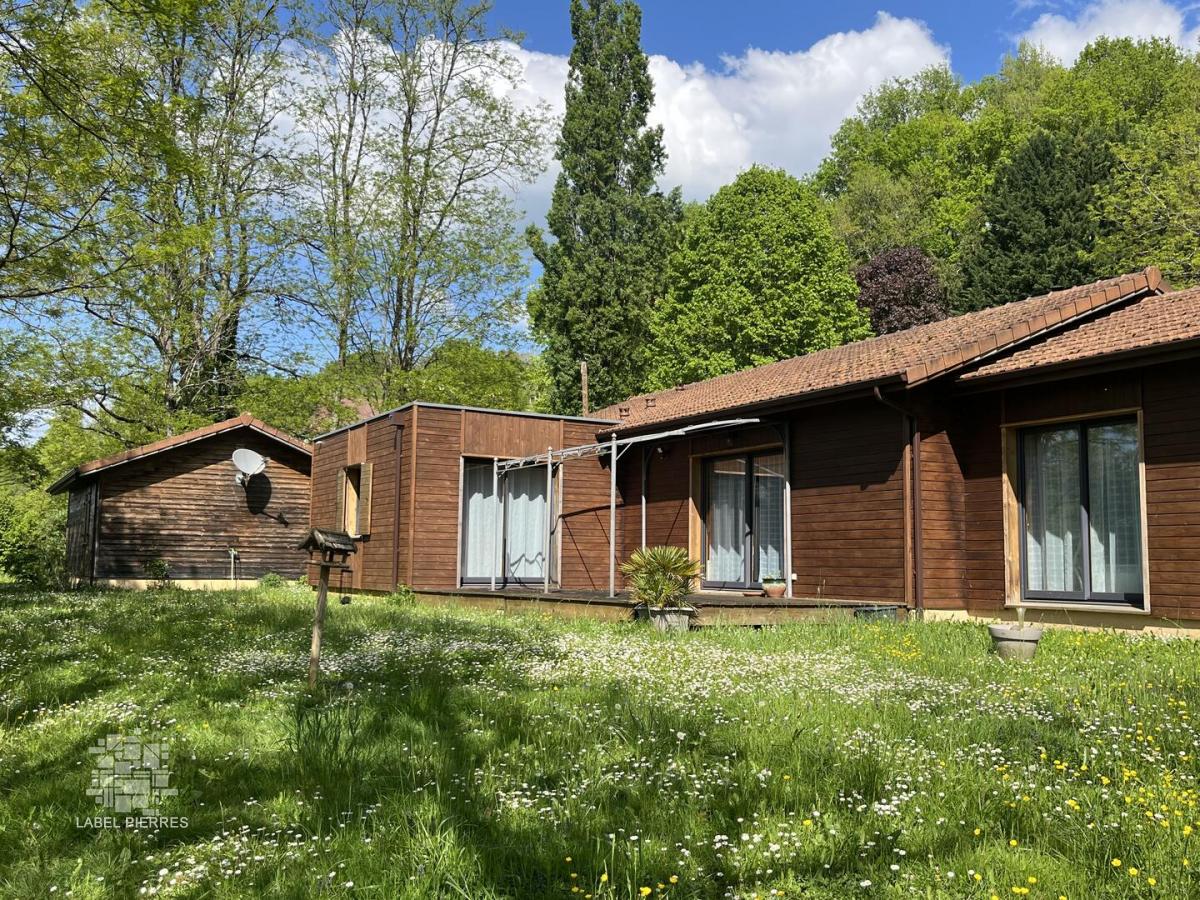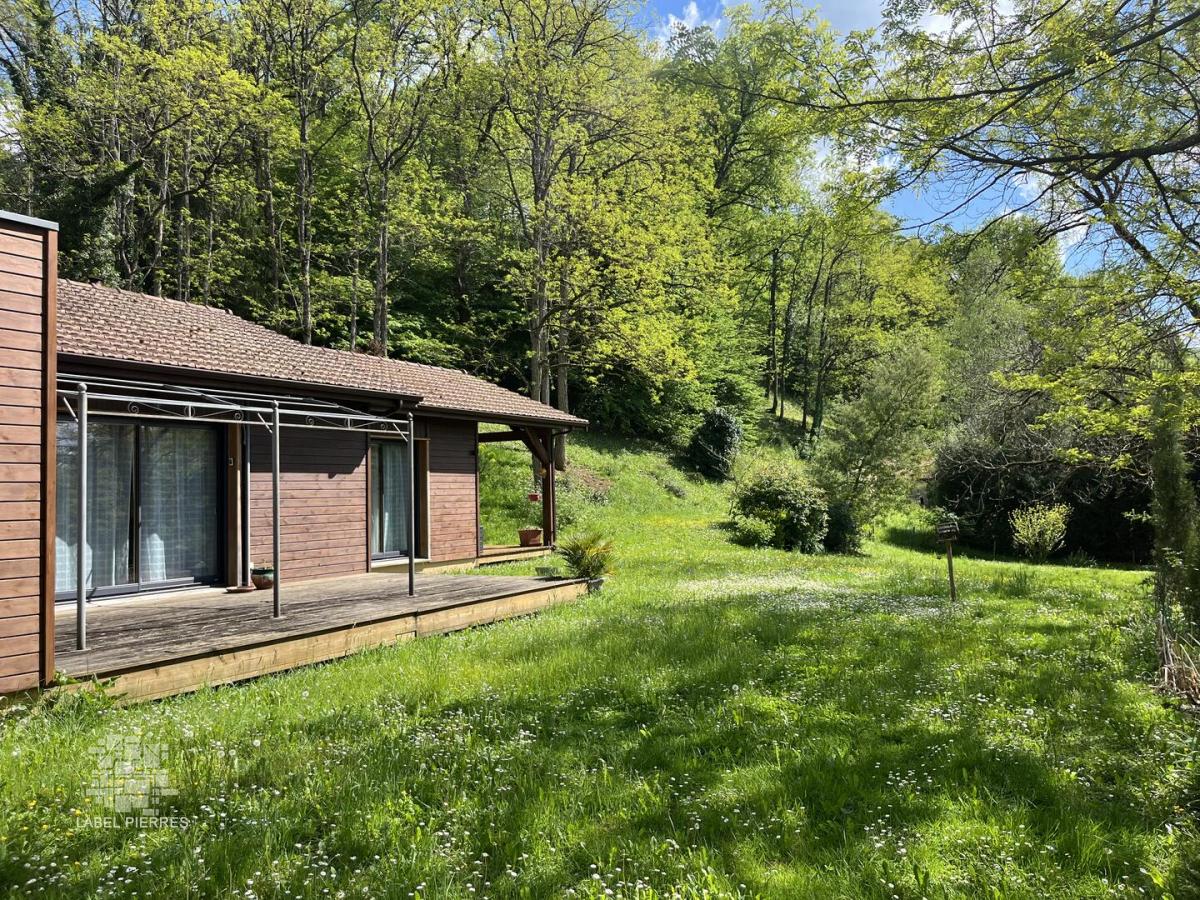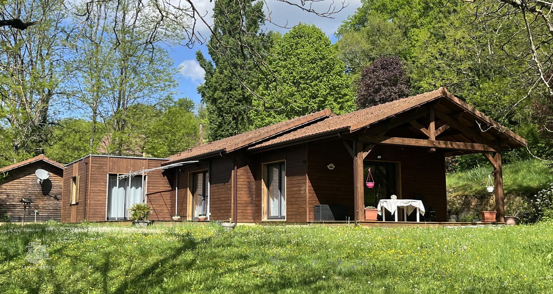 En Vallée Vézère, à 5 minutes de Montignac-Lascaux, maison en bois récente et de qualité avec double garage. 135 m2 habitables de plain pied sur terrain arboré d'environ 2300 m2.
