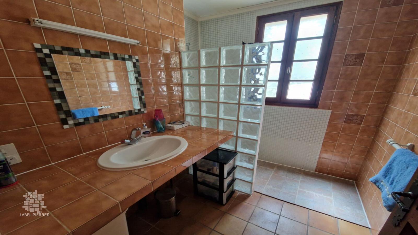 - Salle de bains - 7 m² : accès baignoire par 2 marches = baignoire enterrée + grand miroir + sèche serviettes électrique