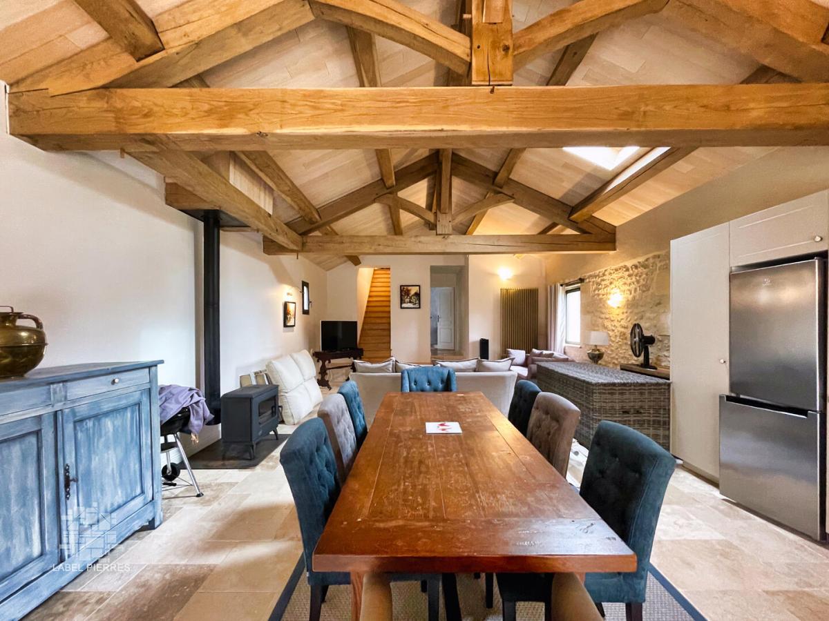 - Salon de 31 m2 avec cheminée en pierre et poêle à bois - poutraison