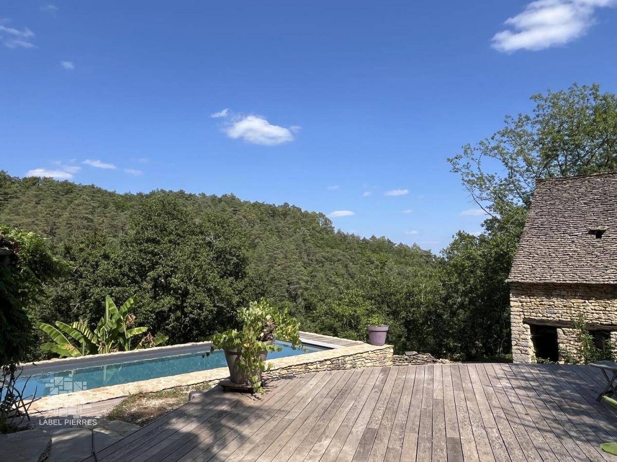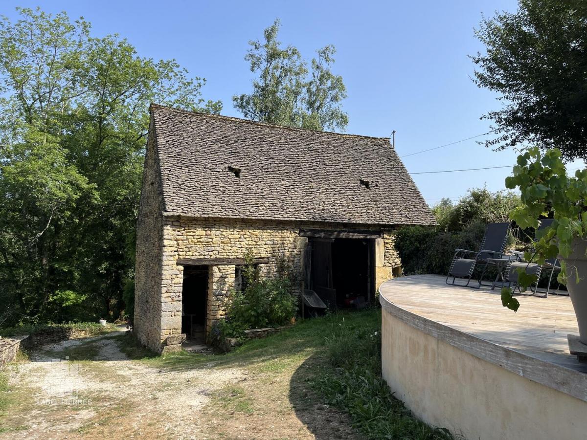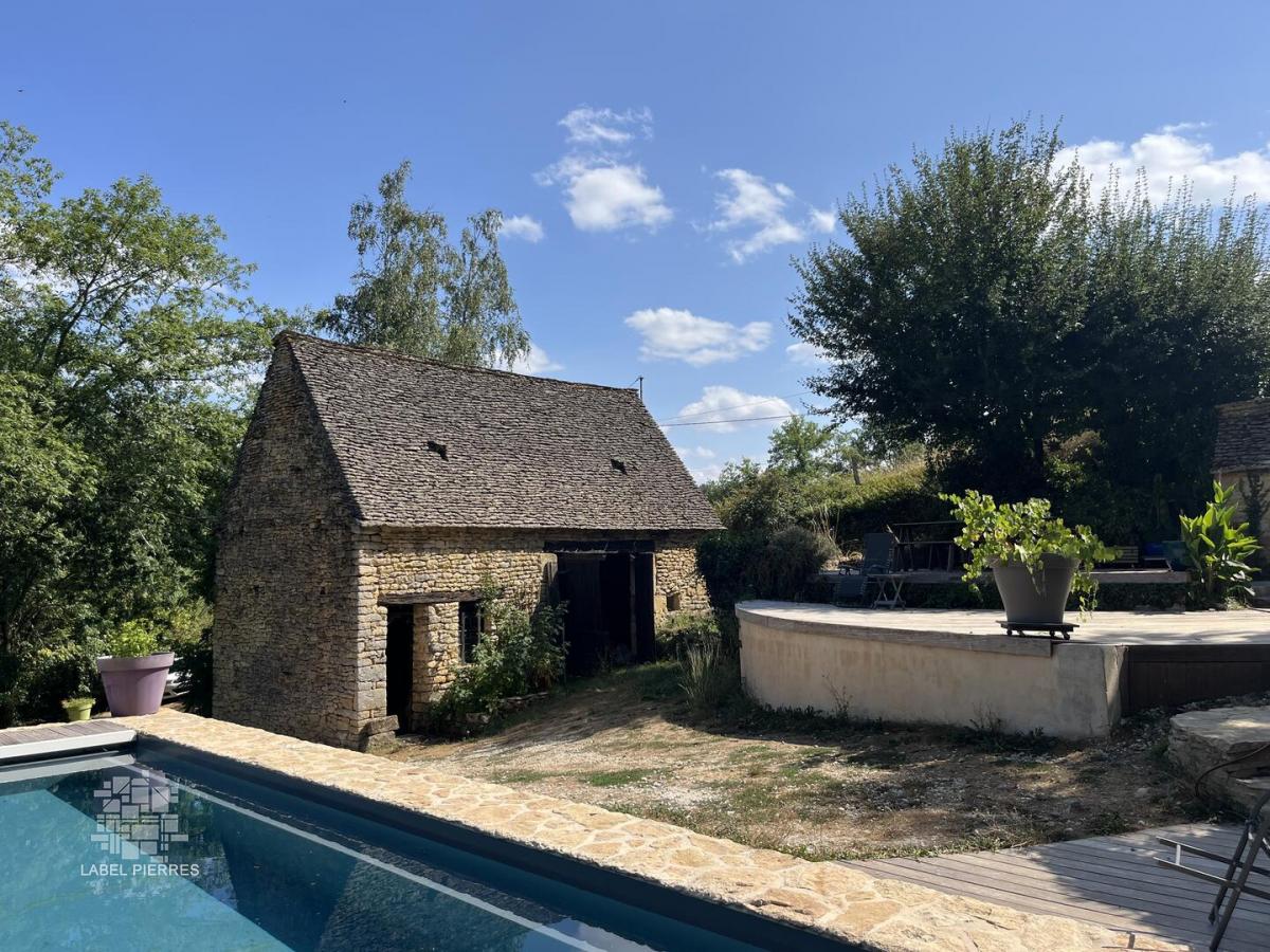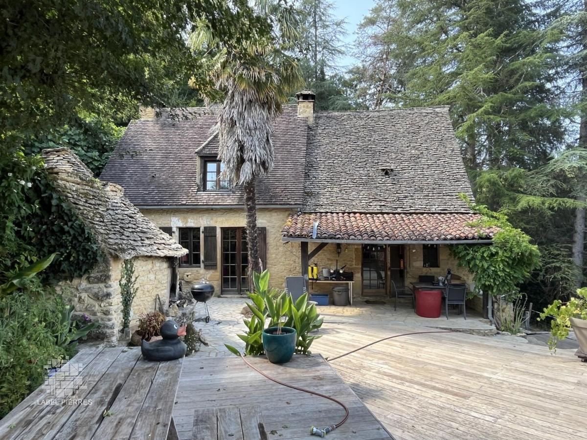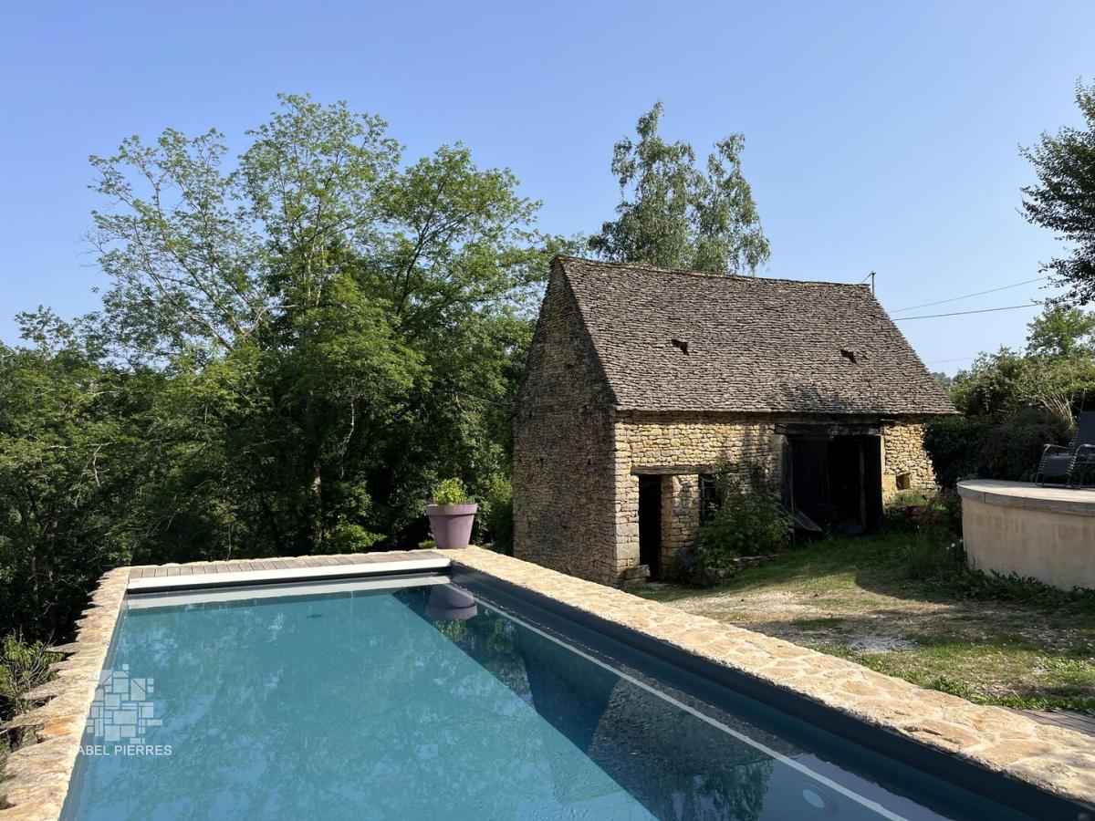 En Périgord Noir, située à 4 km d'un village avec tous les commerces, perchée sur la colline, dans une vallée protégée, cette propriété de caractère authentique avec piscine est implantée à flanc de coteau sur un terrain d'environ 4500 m². Elle se compose de la maison d'habitation d'environ 85 m² habitables au sol comprenant une belle pièce de vie au rdc avec cuisine équipée et salon avec cheminée typique et sol en pisé. A l'étage: deux petites chambres mansardées ainsi qu'une salle d'eau. Une grande terrasse en bois exotique relie la maison à une belle grange de 35 m² environ couverte de lauzes, surplombe la piscine chauffée et permet de profiter de la vue entre la cime des arbres. Situation rare. Les informations sur les risques auxquels ce bien est exposé sont disponibles sur le site Géorisques: www.georisques.gouv.fr