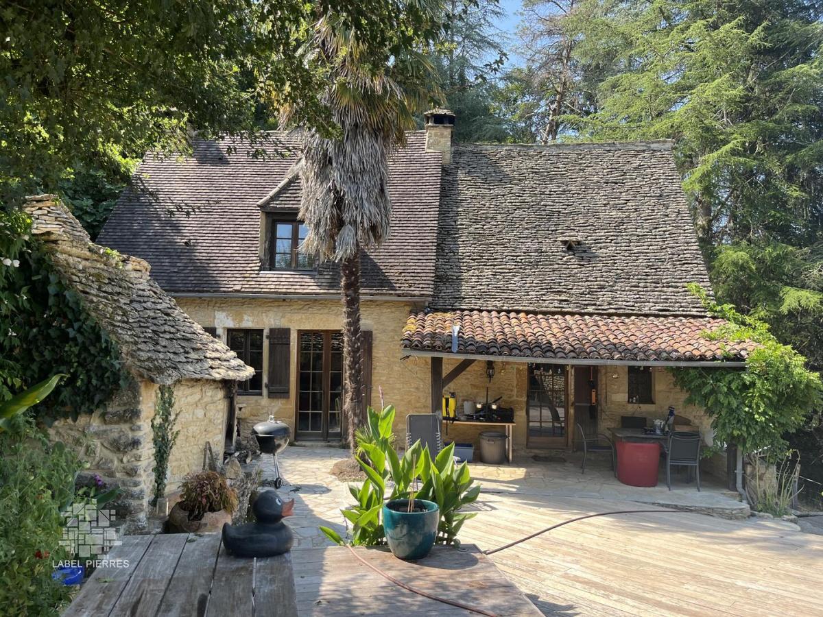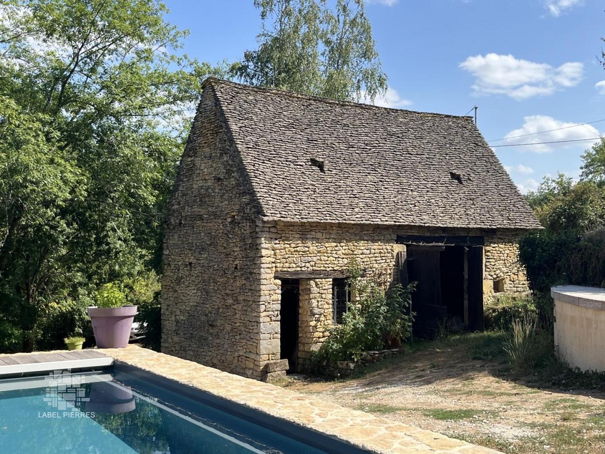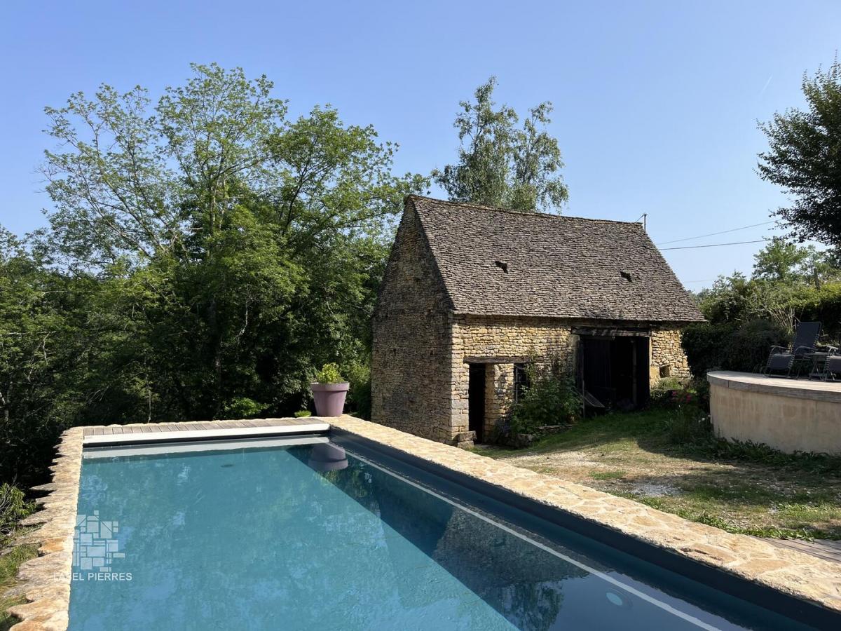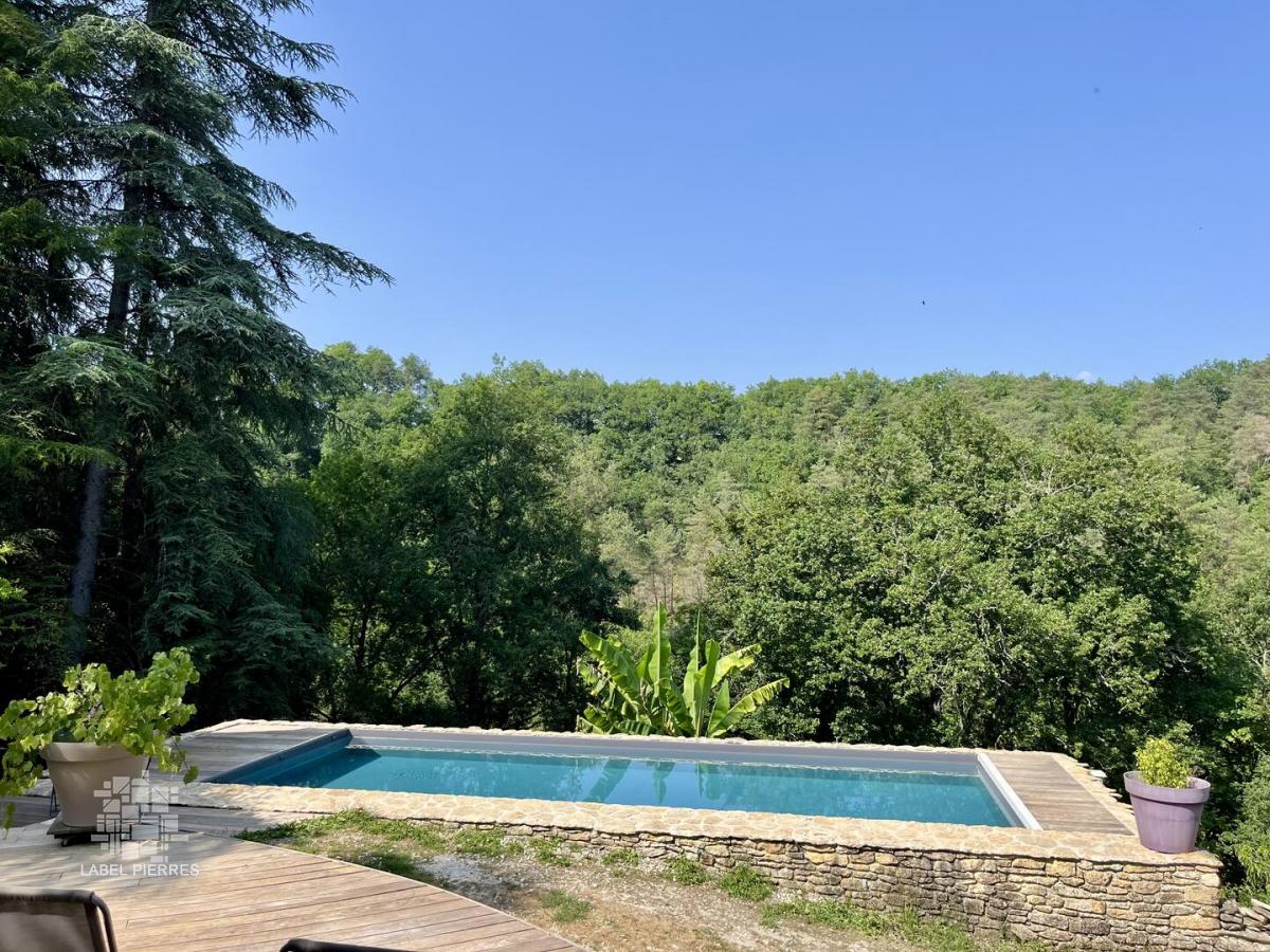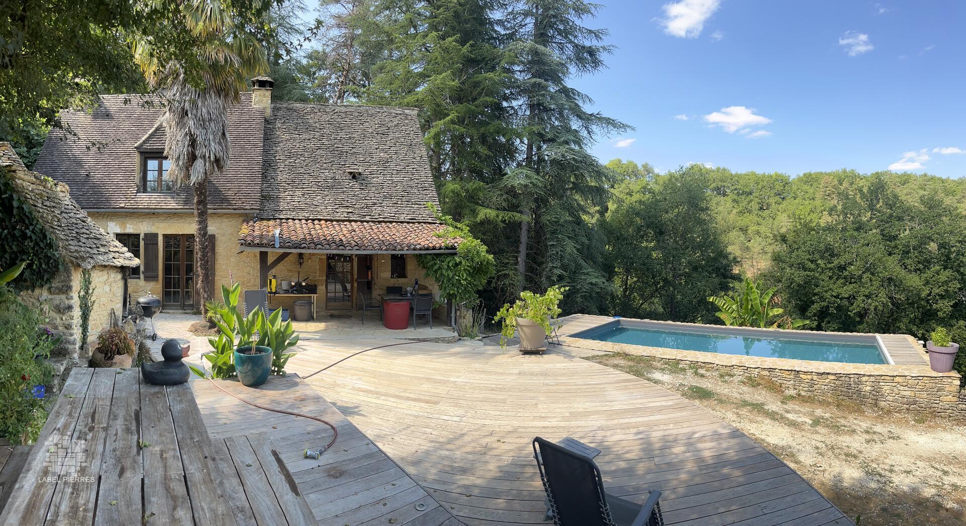 En Périgord Noir, située à 4 km d'un village avec tous les commerces, perchée sur la colline, dans une vallée protégée, cette propriété de caractère authentique avec piscine est implantée à flanc de coteau sur un terrain d'environ 4500 m². Elle se compose de la maison d'habitation d'environ 85 m² habitables au sol comprenant une belle pièce de vie au rdc avec cuisine équipée et salon avec cheminée typique et sol en pisé. A l'étage: deux petites chambres mansardées ainsi qu'une salle d'eau. Une grande terrasse en bois exotique relie la maison à une belle grange de 35 m² environ couverte de lauzes, surplombe la piscine chauffée et permet de profiter de la vue entre la cime des arbres. Situation rare. Les informations sur les risques auxquels ce bien est exposé sont disponibles sur le site Géorisques: www.georisques.gouv.fr