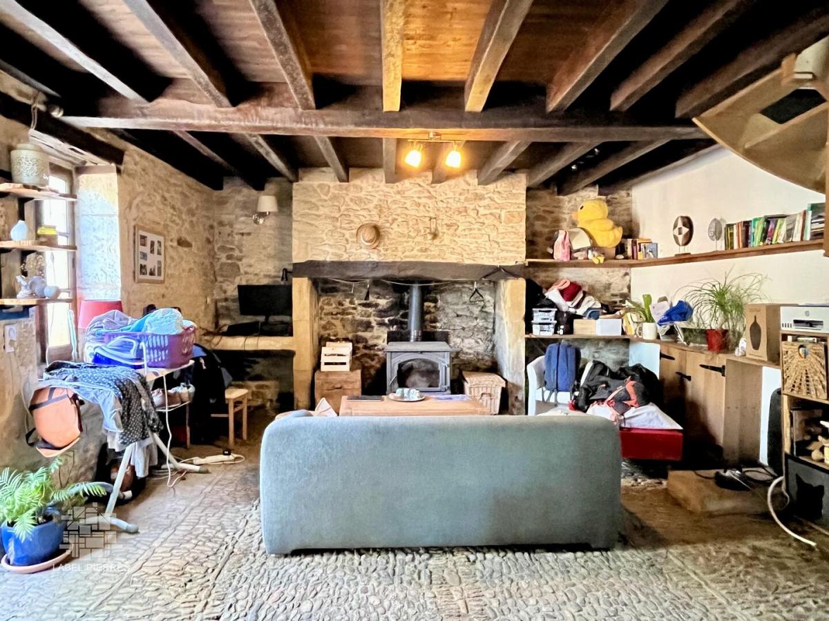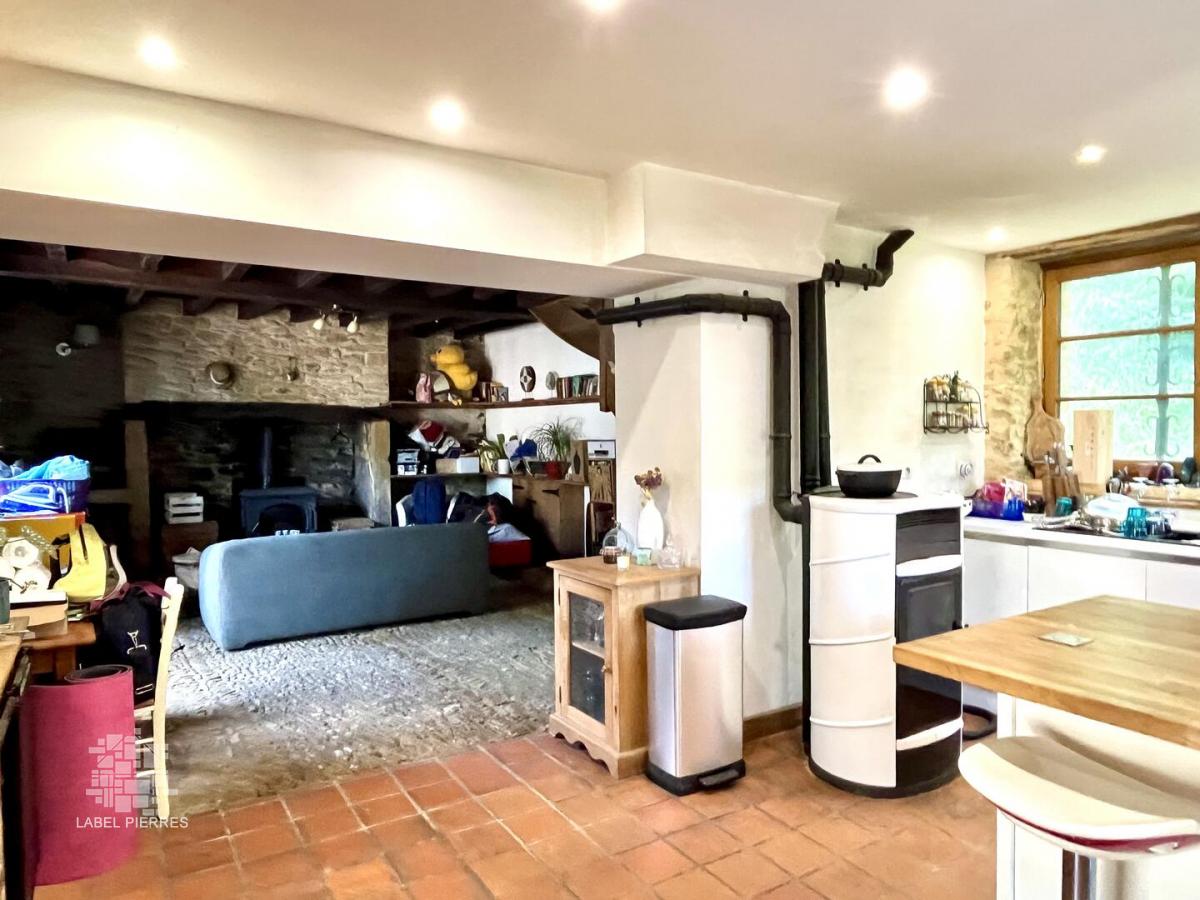 - Séjour d'environ 50 m² avec cuisine ouverte et salon avec cheminée, sol en pisé et poutres apparentes