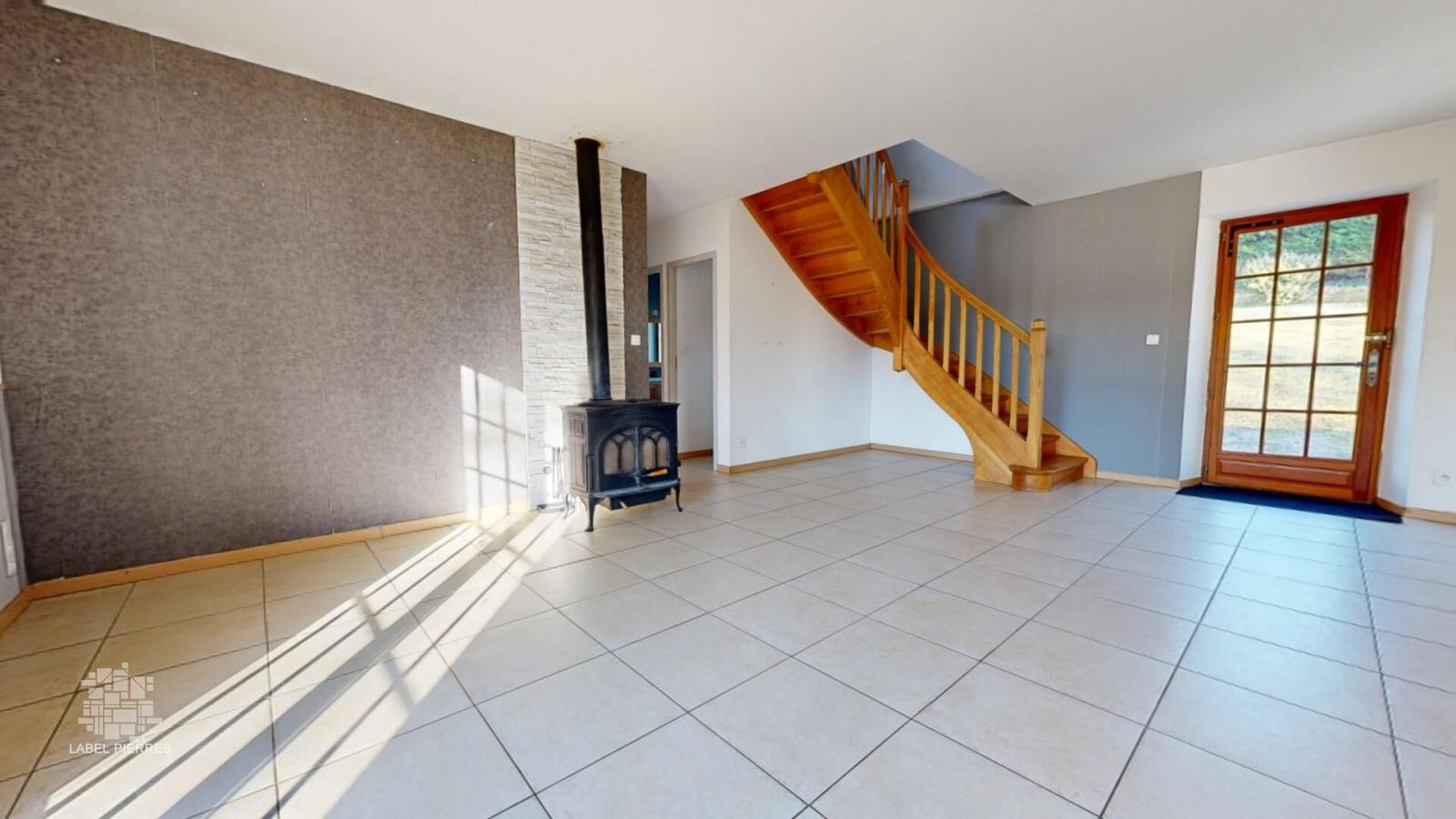 • Pièce à vivre 57m2 Cuisine aménagée éléments hauts et bas bois/Salle à manger/Salon, poele à bois