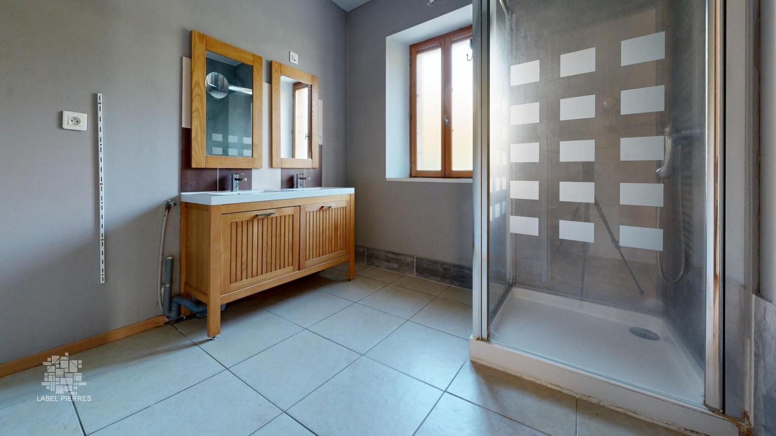 • Salle d'eau 7,3m2 Double vasque, douche, rad Sèche serviette.