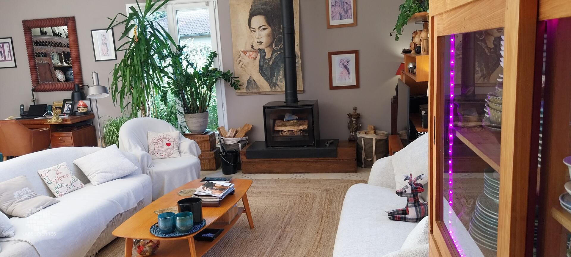 - Pièce à vivre de 47 m² avec baies vitrées, fenêtres traversantes et cheminée-insert ouvert.
