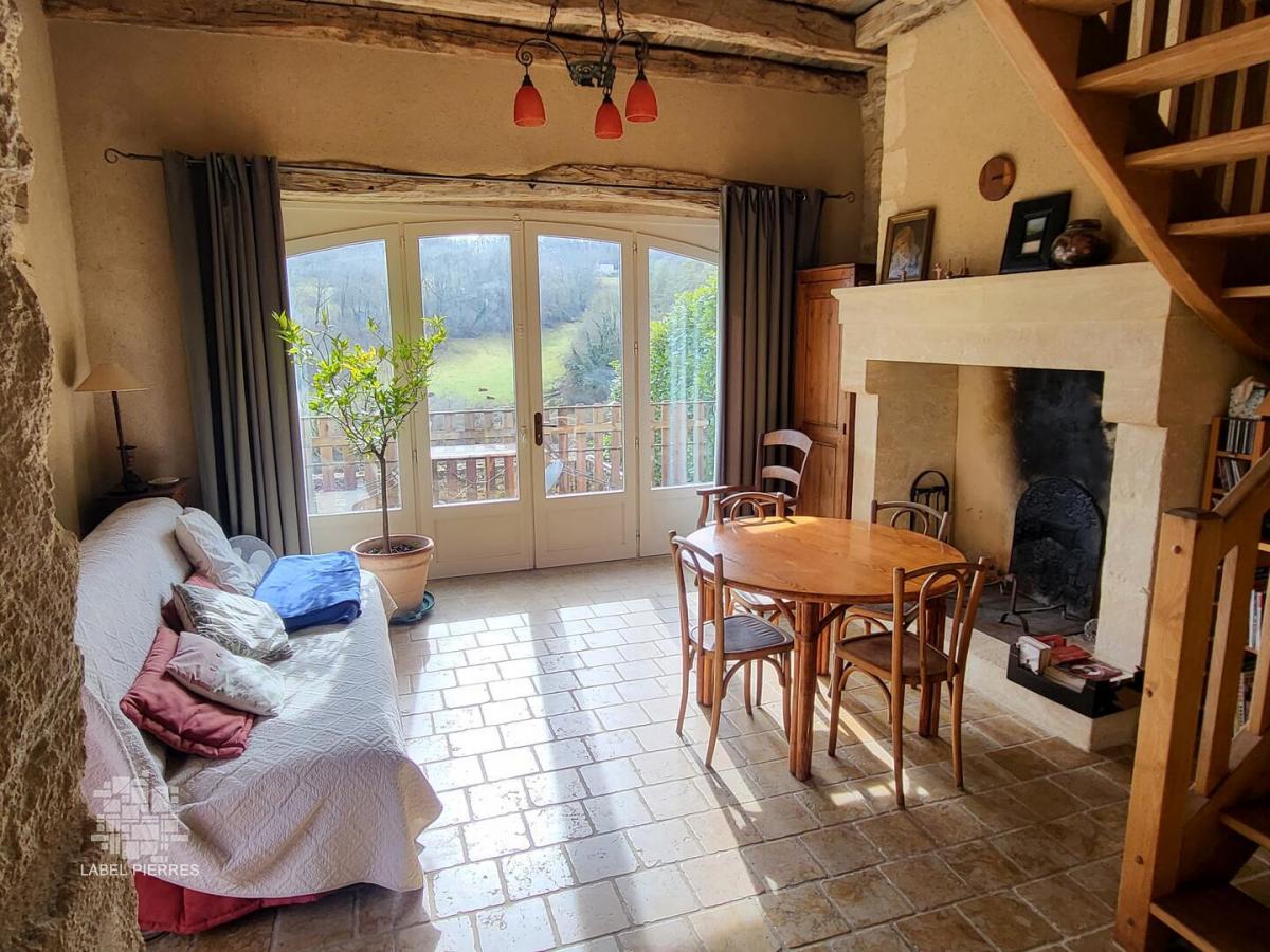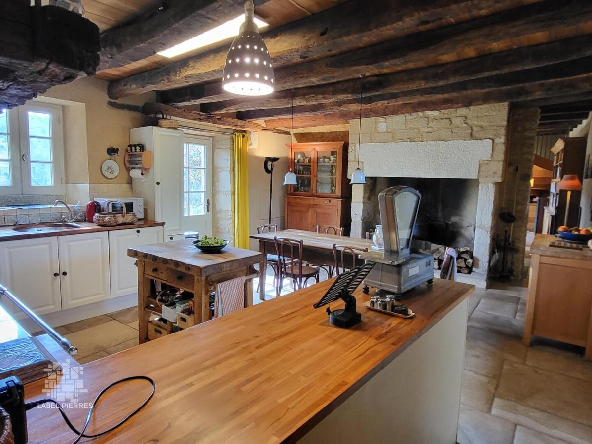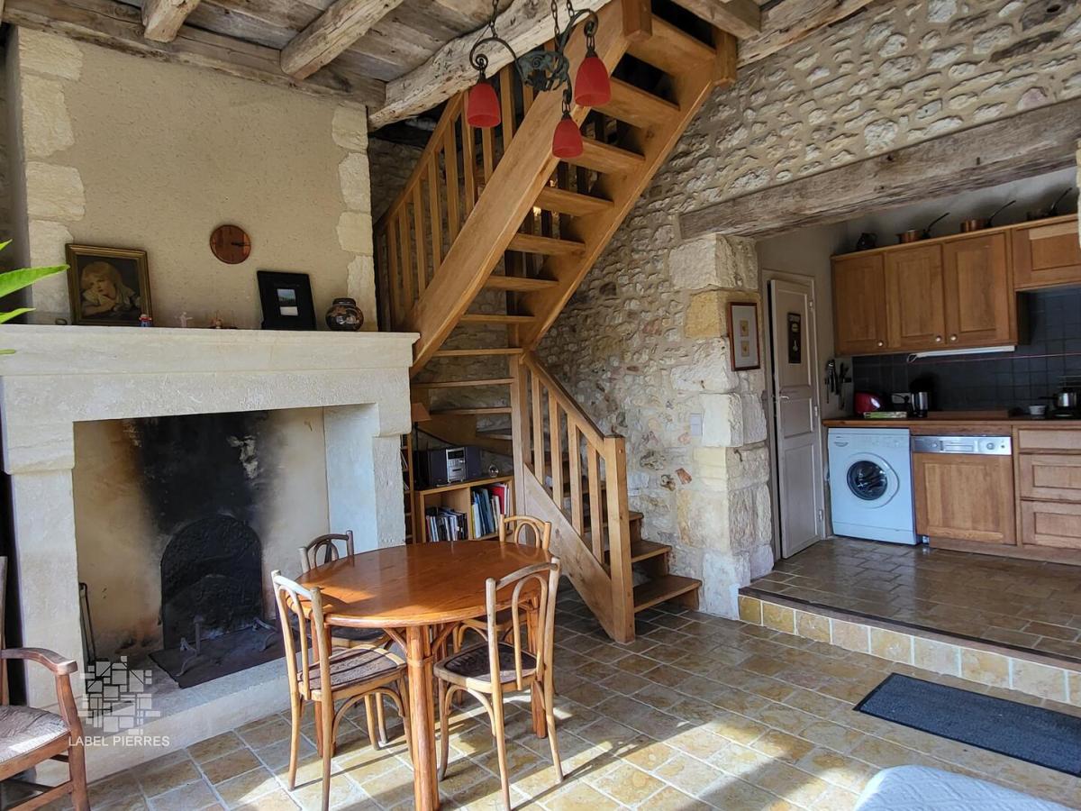 - Cuisine / Salle à manger d'environ 34 m² avec cheminée en pierre et porte donnant sur terrasse