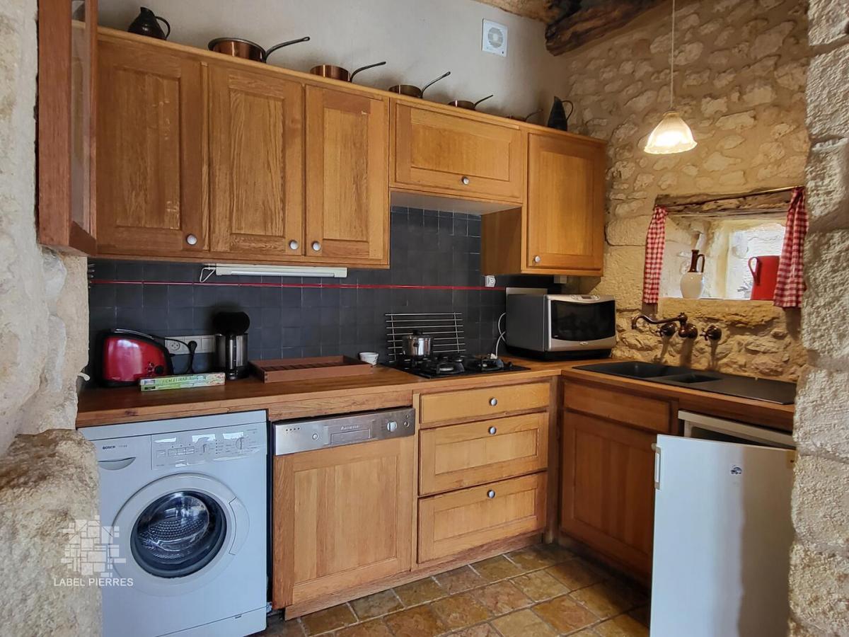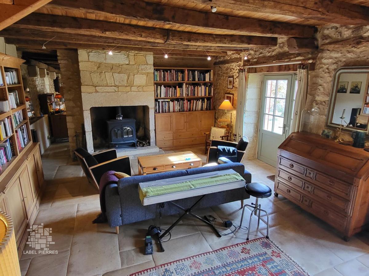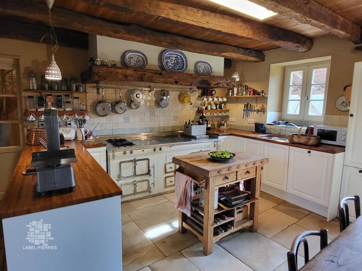 - Cuisine / Salle à manger d'environ 34 m² avec cheminée en pierre et porte donnant sur terrasse