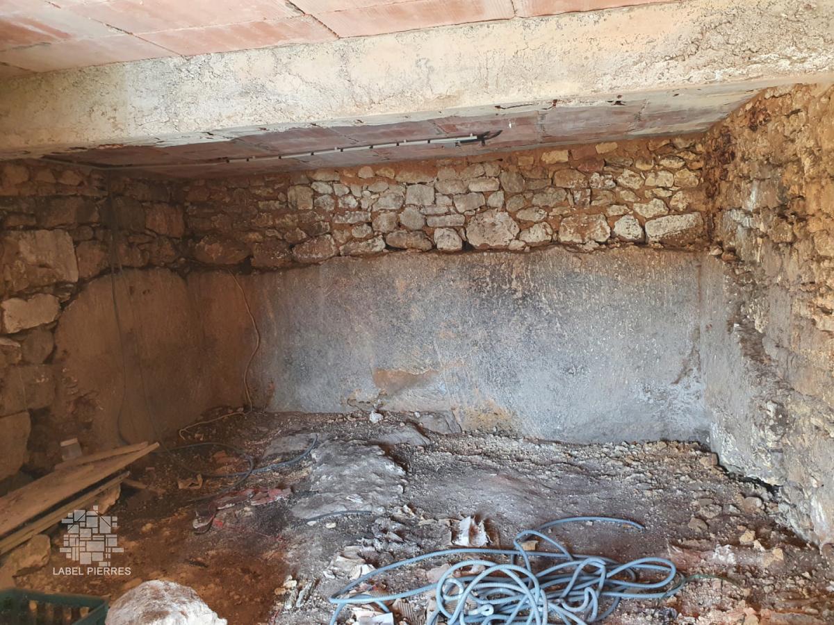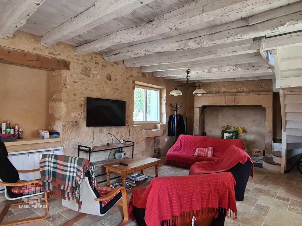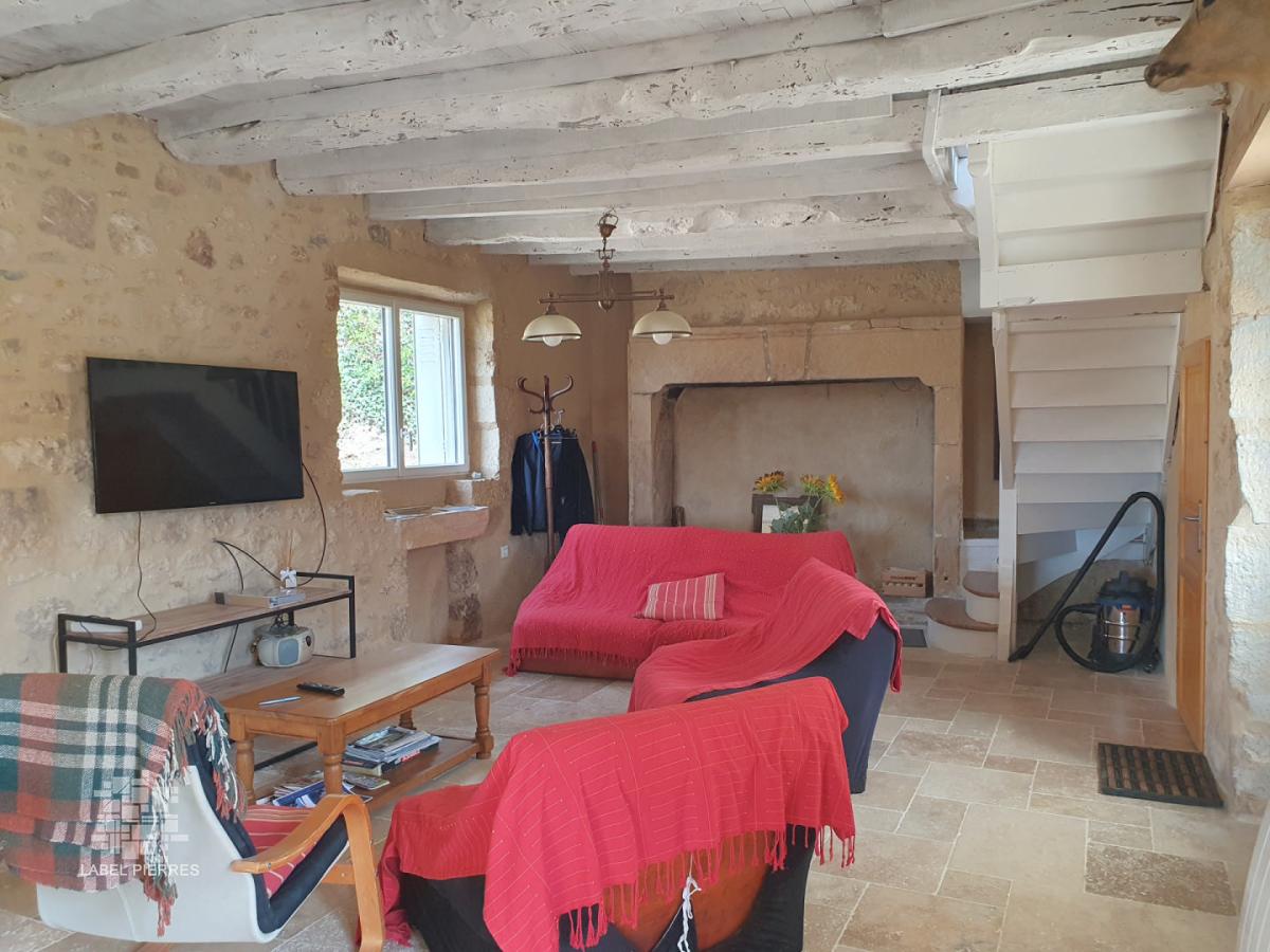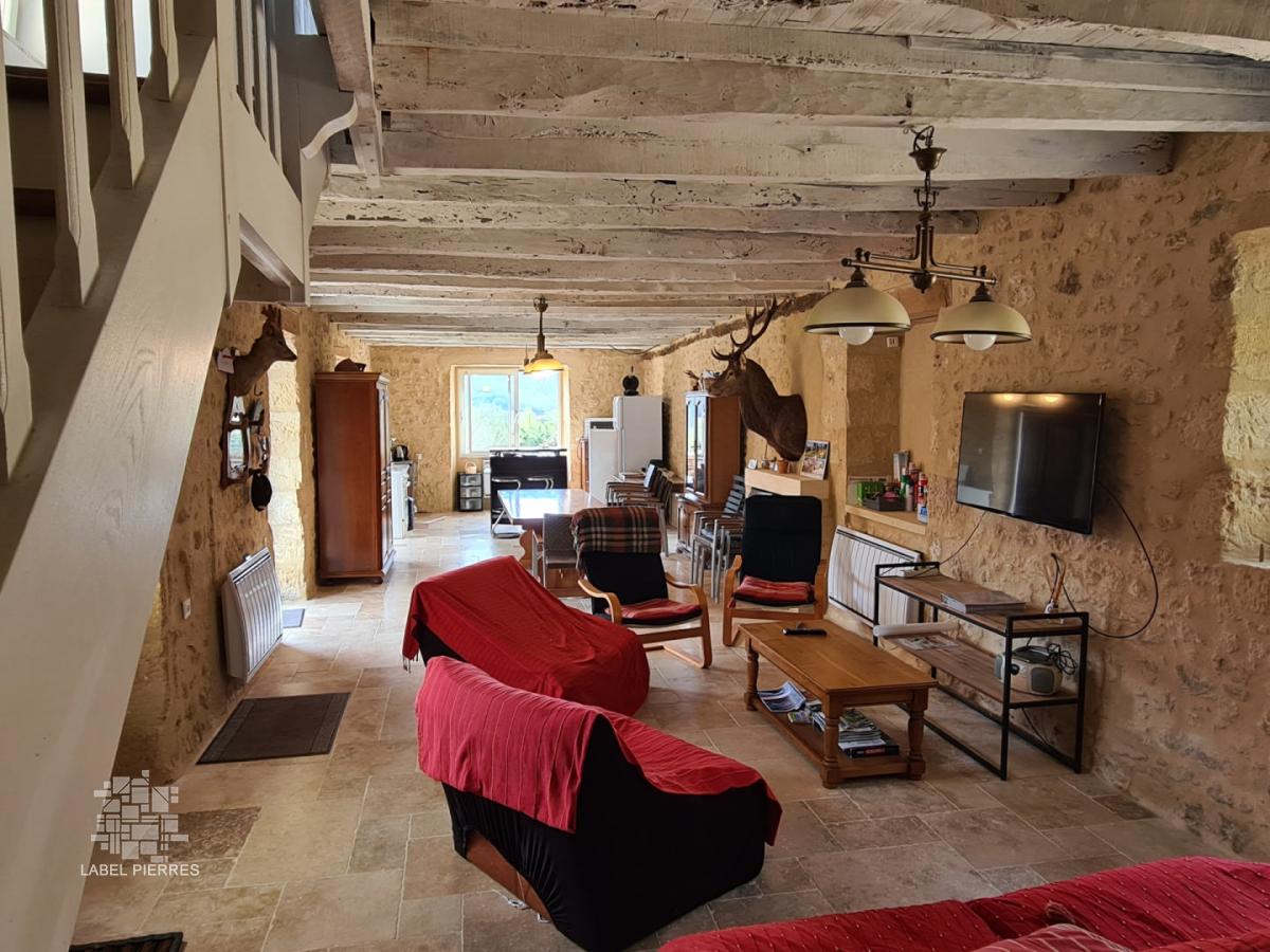 - Pièce à vivre de 59m² avec évier et cheminée en pierres
