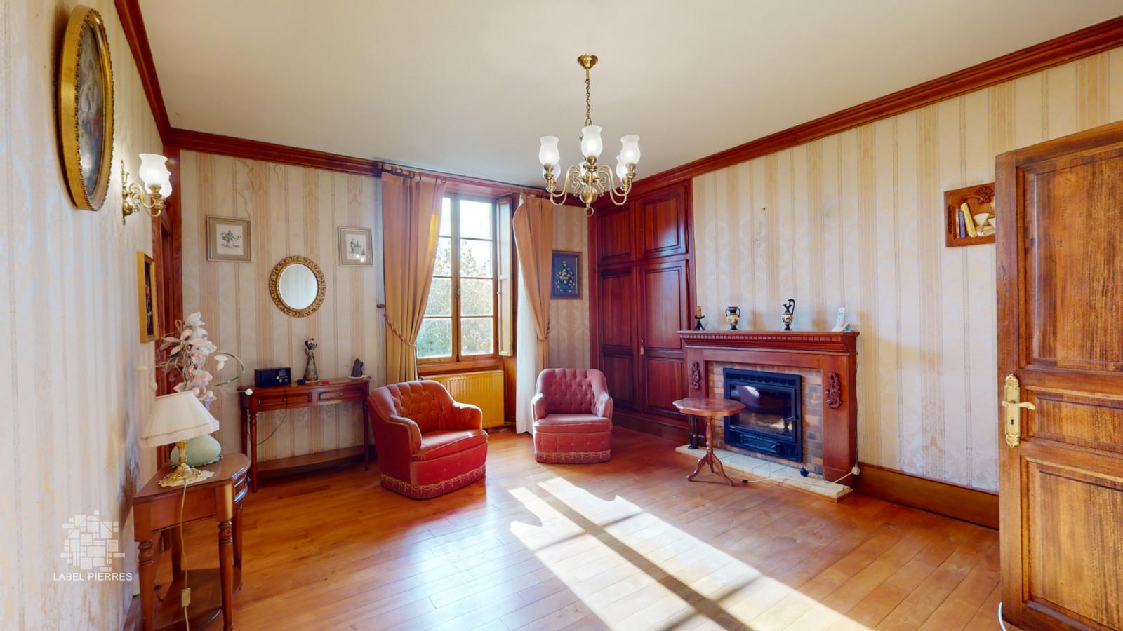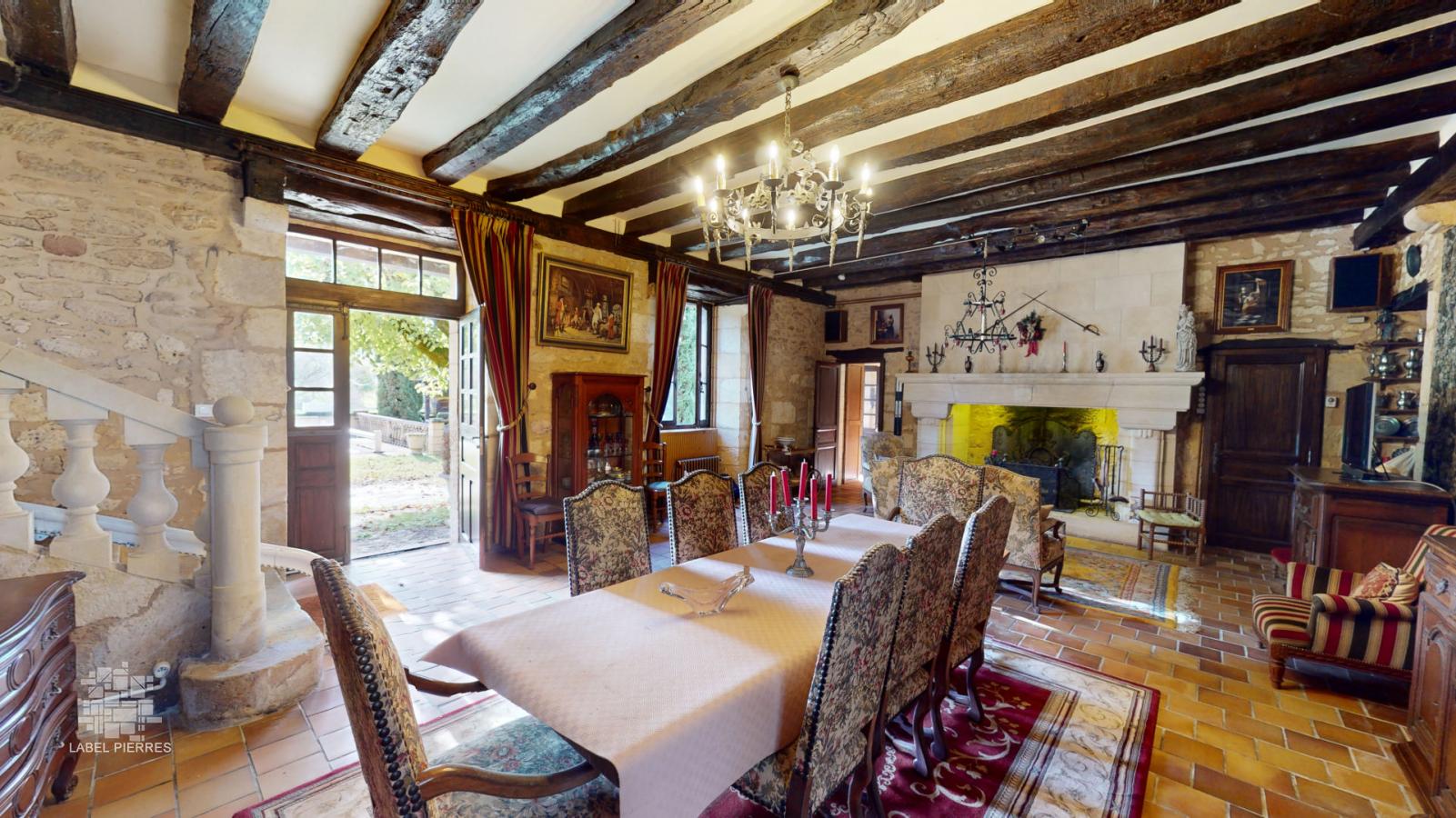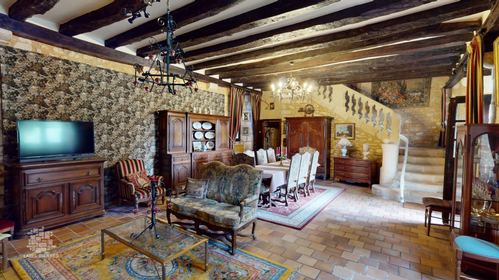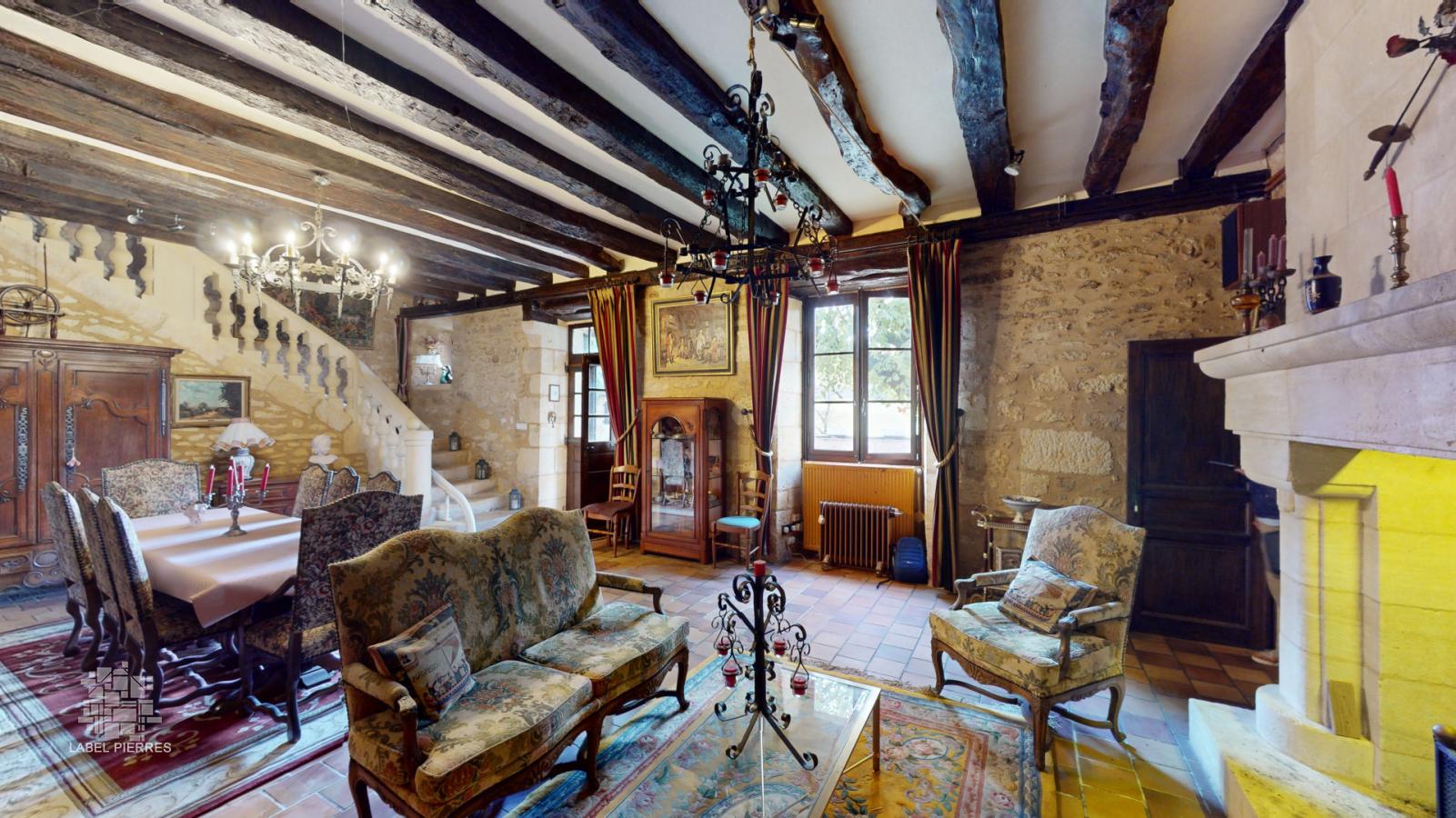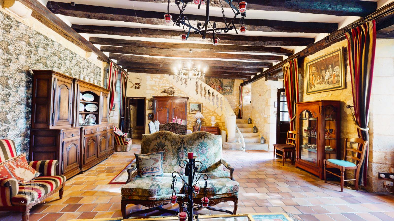 • Pièce à vivre d'environ 55 m² avec cheminée et escalier en pierre.