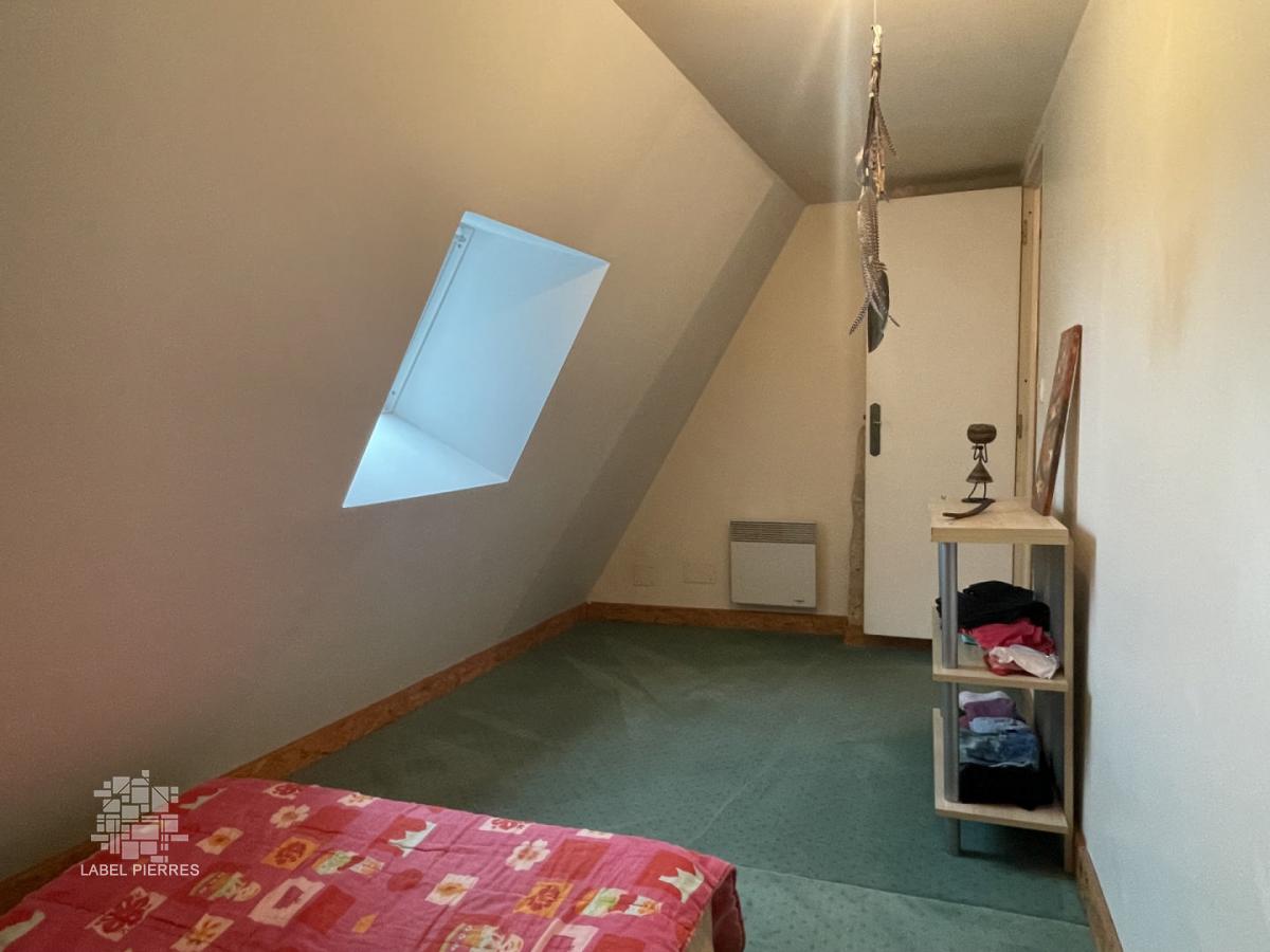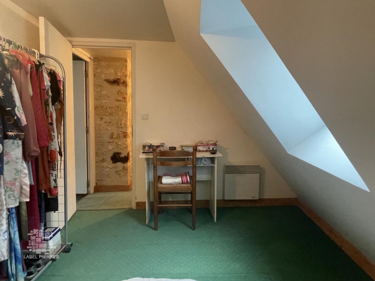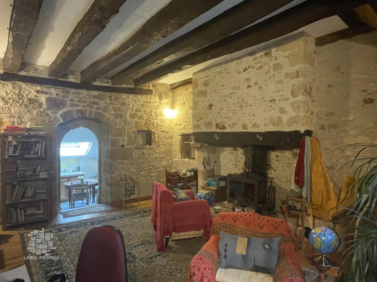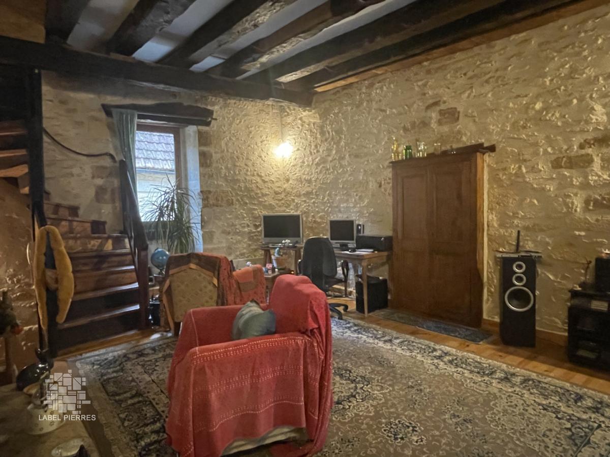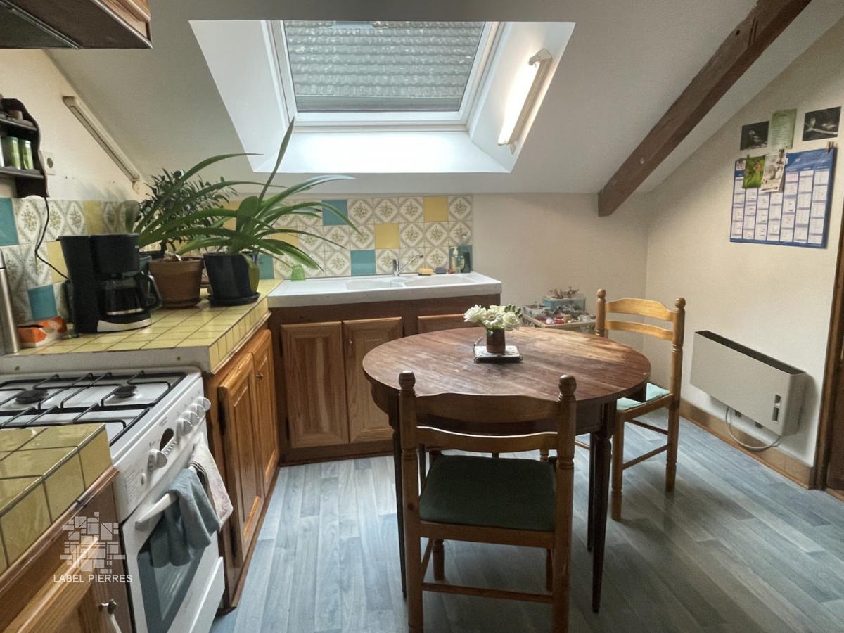• Pièce à vivre de 28 m² avec cheminée, pierres apparentes et parquet.Cuisine d'environ 10 m².