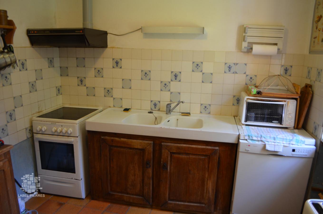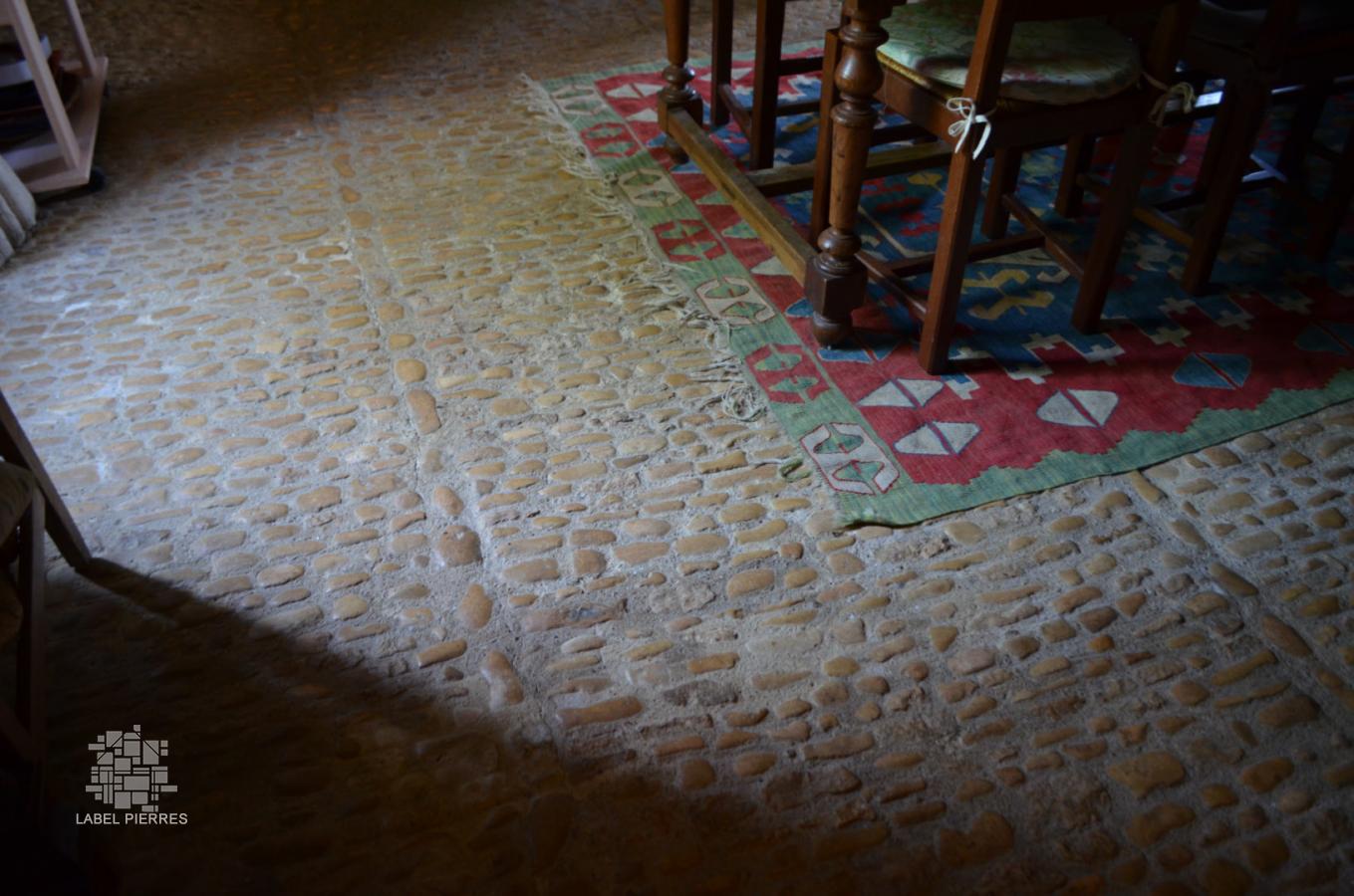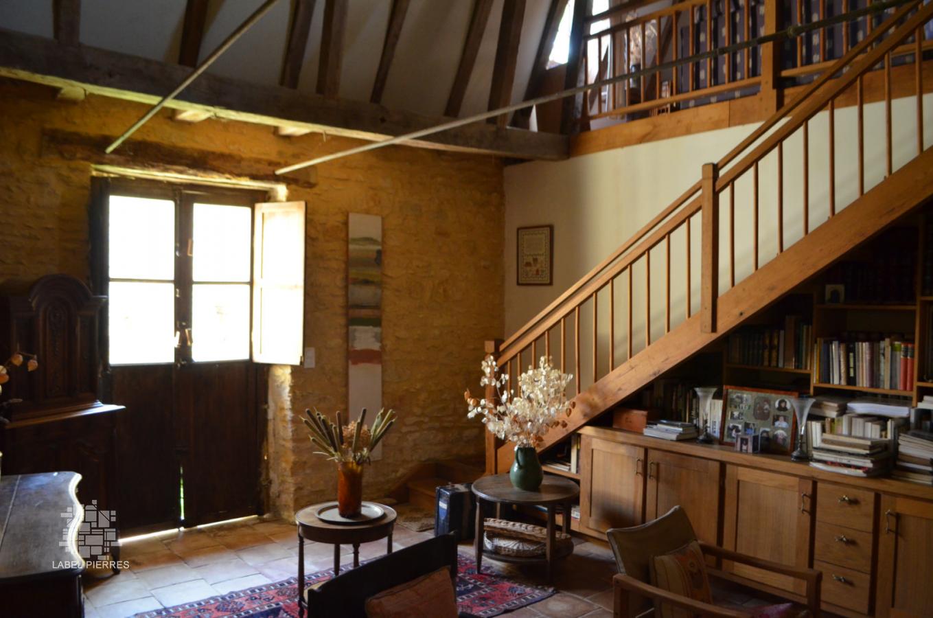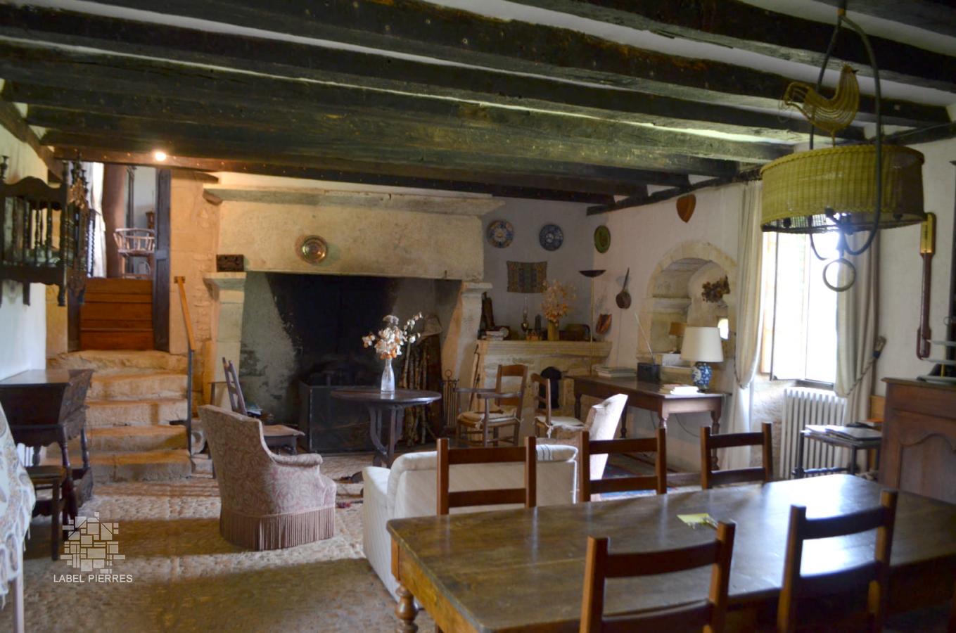 • Séjour de 44 m² avec cheminée, potager, évier en pierre et sol en pisé.