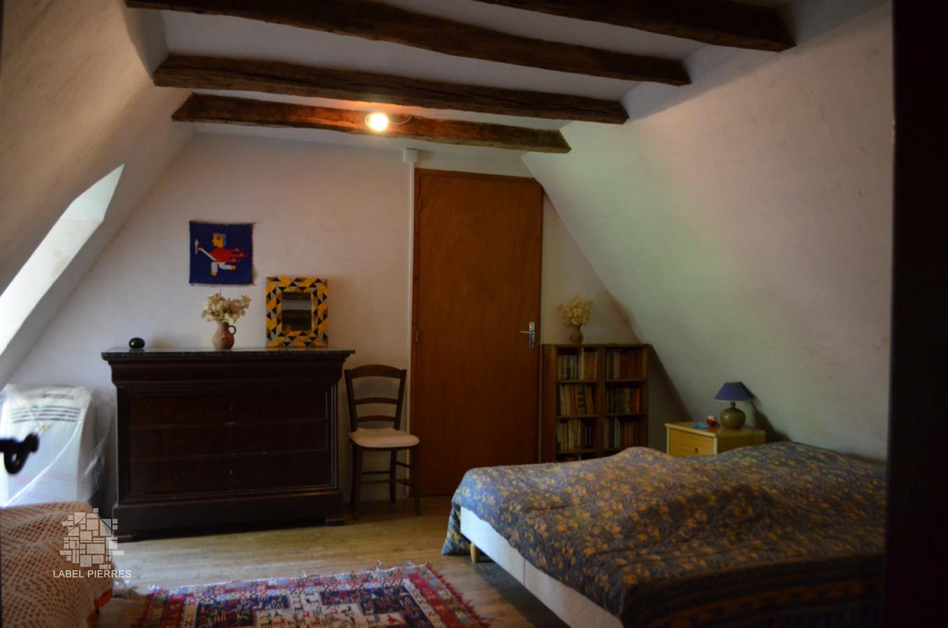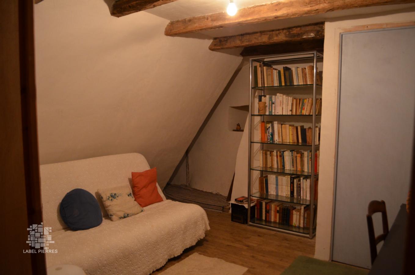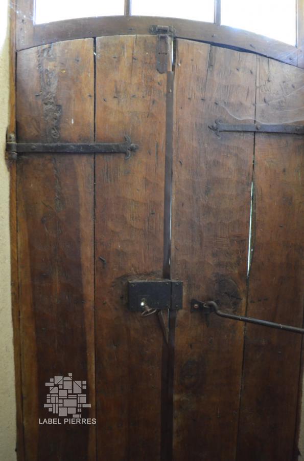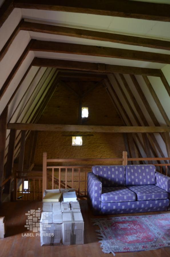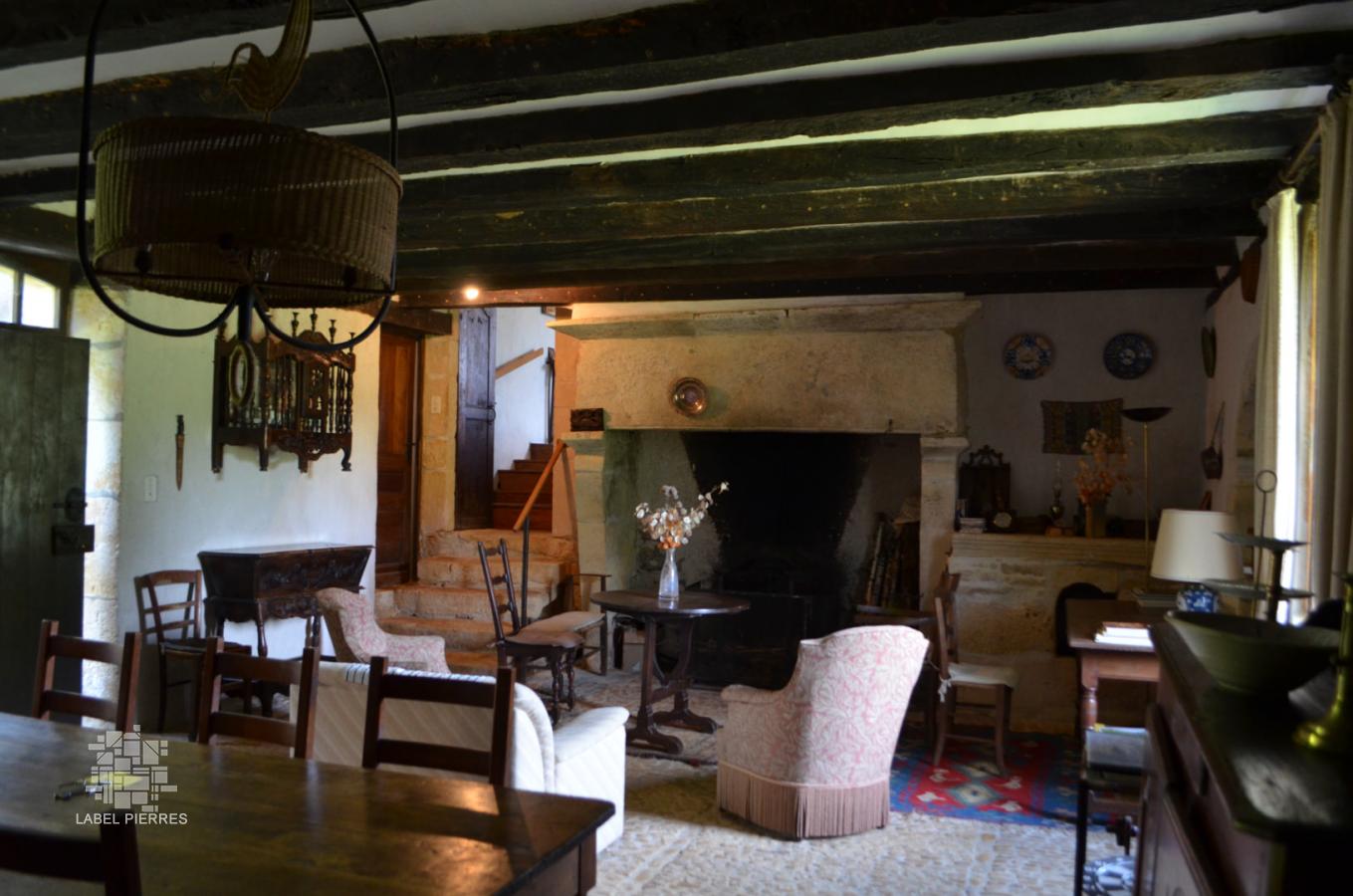 • Séjour de 44 m² avec cheminée, potager, évier en pierre et sol en pisé.