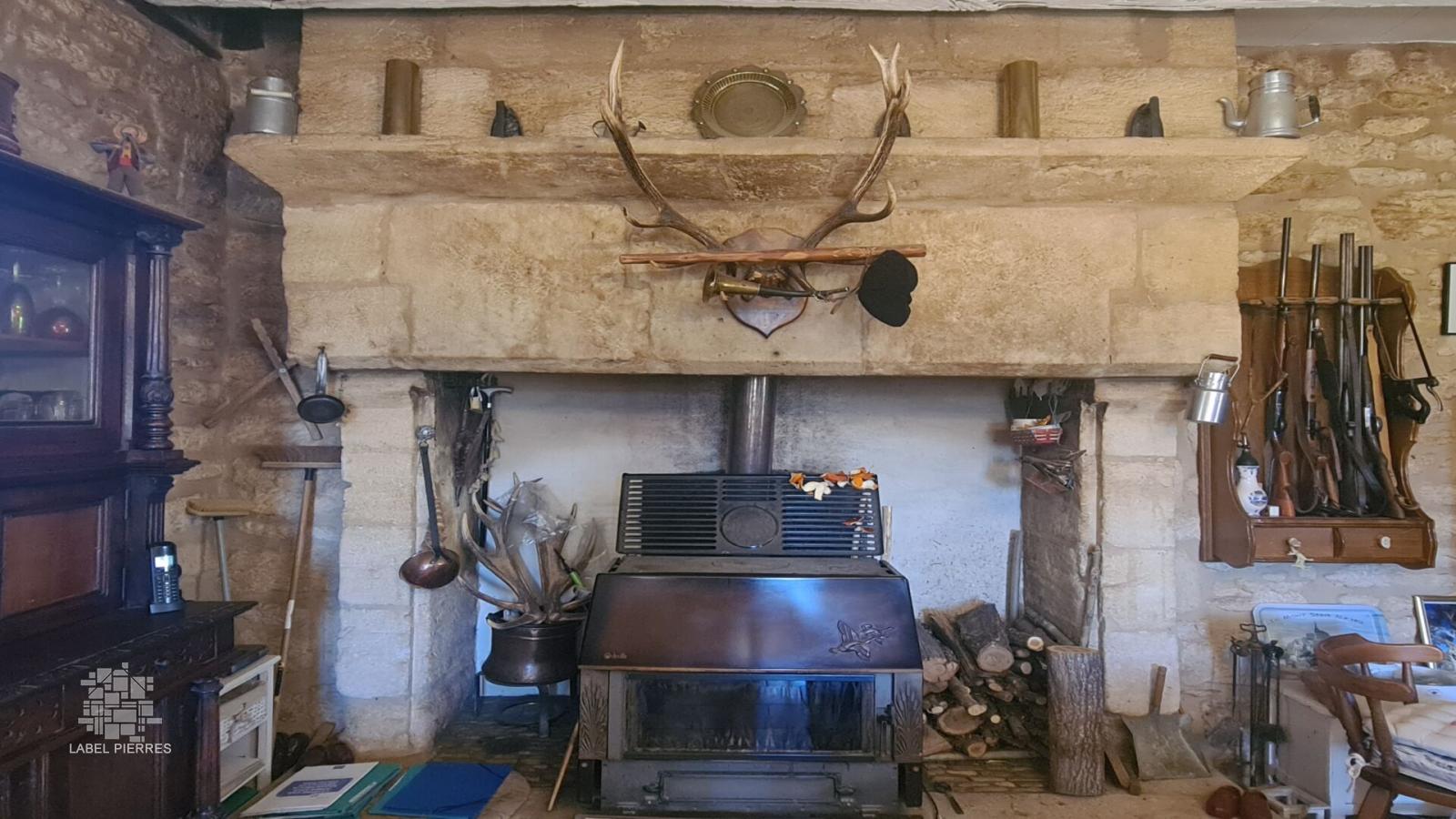 • Pièce de vie de 50m² avec cheminée, poêle à bois et évier en pierre
